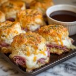 Delicious Baked French Dip Biscuits featuring tender roast beef and melted provolone cheese wrapped in flaky biscuit dough, brushed with a flavorful herb butter, and served with warm beef broth for dipping. Perfect for a comforting snack or casual meal.
