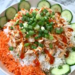 - Assemble the bowl: In serving bowls, layer the cooked rice, then top with the cooked chicken, shredded carrots, and sliced cucumbers.
