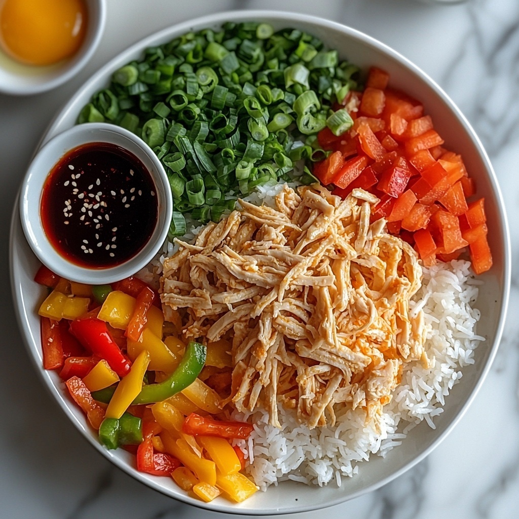 Bang Bang Fried Rice is a quick and flavorful stir-fried rice dish featuring day-old jasmine or basmati rice, tender shredded chicken (or tofu for vegetarians), succulent shrimp, and a vibrant mix of vegetables. The dish is stir-fried in a hot skillet with garlic, bell peppers, peas, and a medley of savory sauces including soy sauce, Sriracha, and sweet chili sauce, finished with a touch of sesame oil and garnished with green onions and sesame seeds. Perfect for a speedy weeknight dinner packed with bold flavors and a spicy kick.