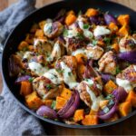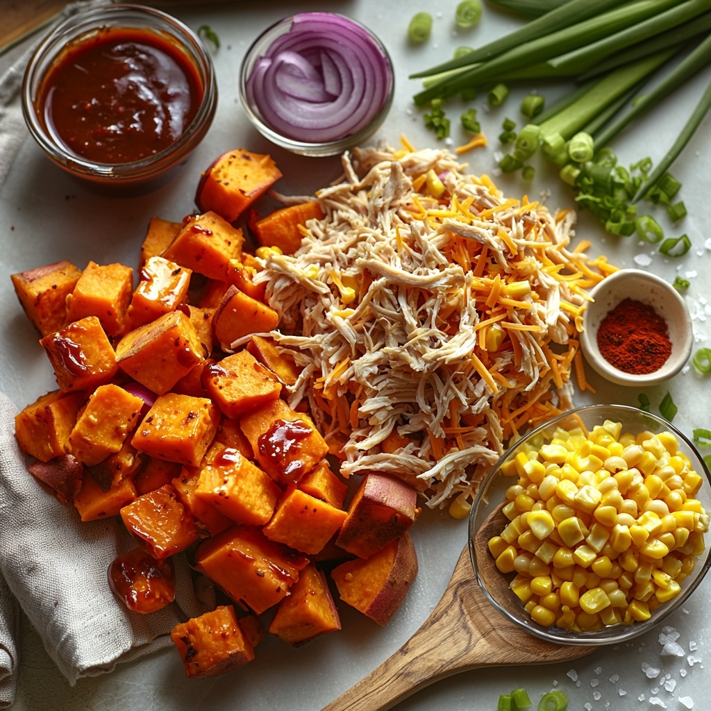 This BBQ Chicken Sweet Potato Skillet is a flavorful and easy one-pan dinner perfect for busy weeknights. Tender sweet potatoes are caramelized and combined with sautéed onions, corn, BBQ sauce, and cooked chicken, then topped with melted cheddar cheese for a comforting, savory meal. Ready in just 45 minutes and serving four, it’s a deliciously simple dinner option.
