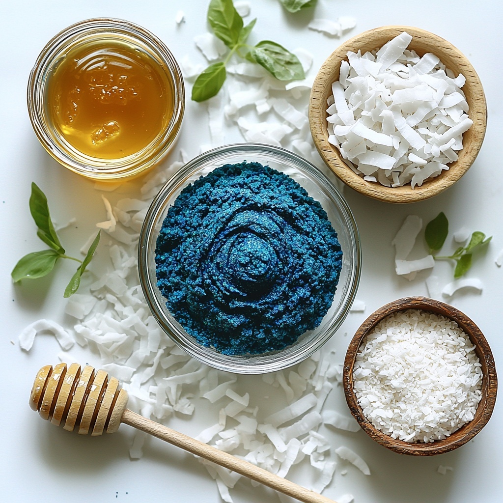 - Combine Ingredients: In a mixing bowl, add shredded coconut, almond butter, honey or maple syrup, blue spirulina powder, almond flour, and salt, ensuring all elements are ready to mix.