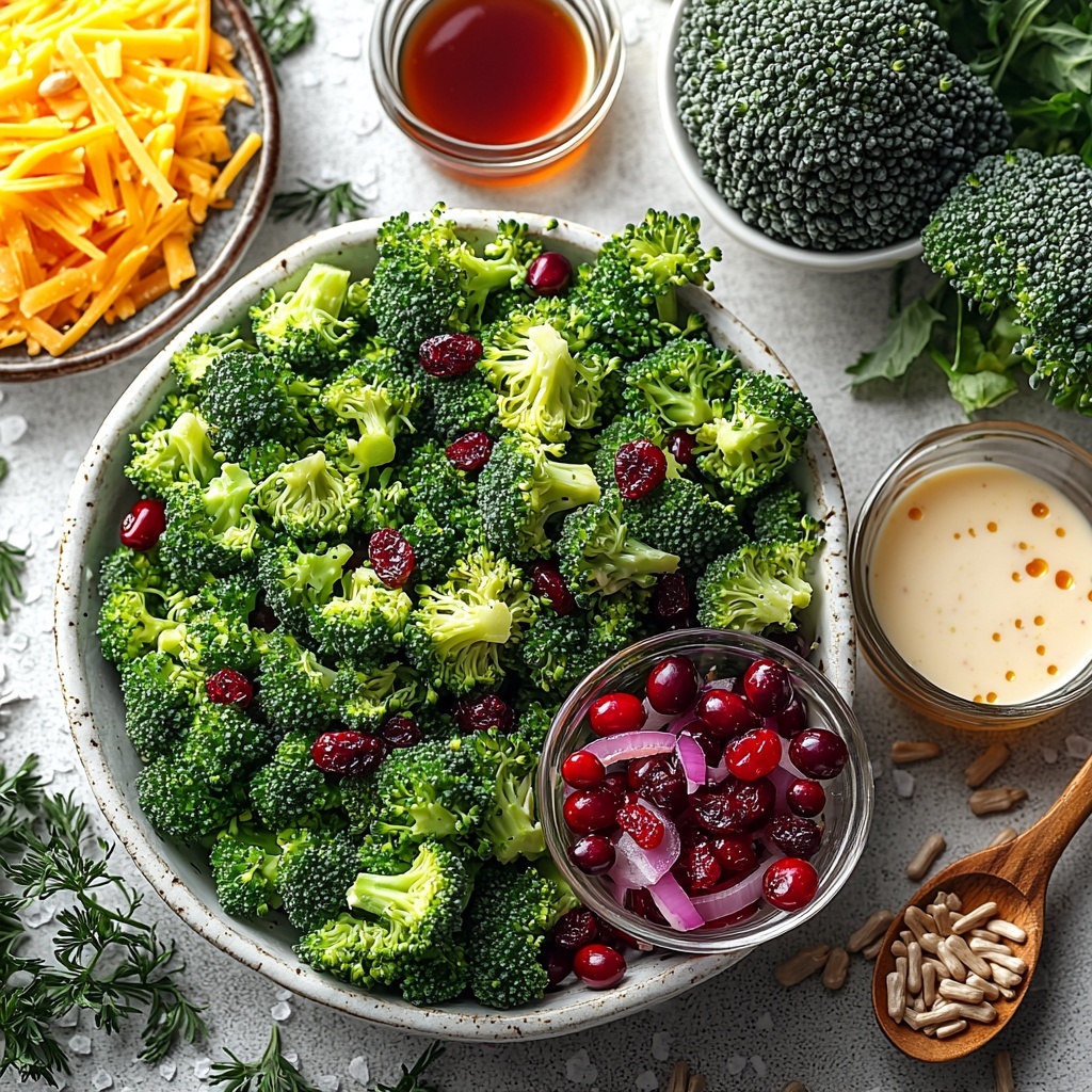A vibrant and crunchy Broccoli Salad with Creamy Dressing that combines fresh broccoli florets, red onion, dried cranberries, sunflower seeds, and cheddar cheese, all tossed in a tangy and slightly sweet homemade dressing. Perfect for a quick, healthy side dish or light lunch.