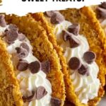 Top each taco with a dollop of whipped cream, then sprinkle mini chocolate chips across the top for a pop of texture and chocolate flavor. For an elegant final touch, dust them lightly with powdered sugar if you like a hint of extra sweetness and pretty presentation.