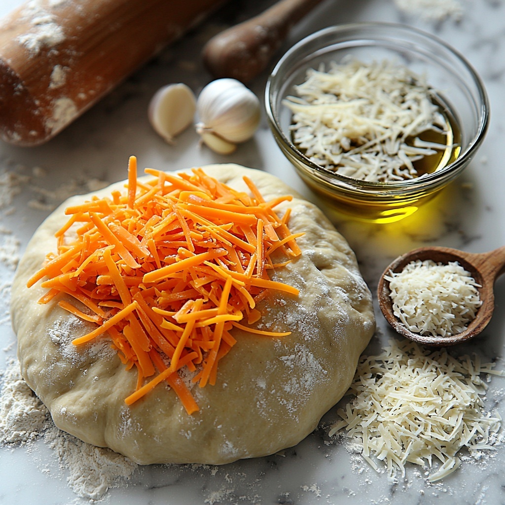 - Add Cheese: Sprinkle the grated cheddar cheese evenly over the rolled dough, then follow with the parmesan cheese to add a rich, savory flavor and enhance the overall cheesiness.