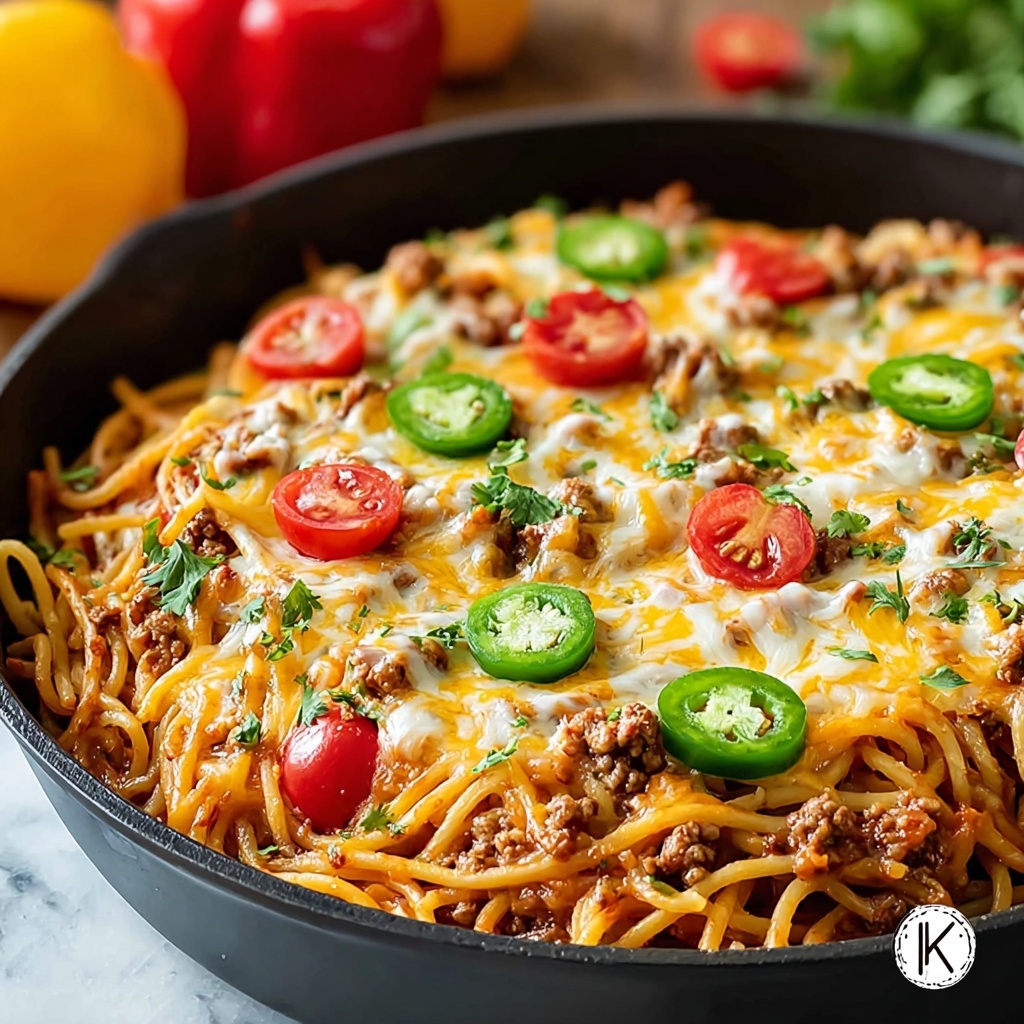 9. Serve: Remove from the oven and serve hot, enjoying the cheesy, flavorful goodness of the taco-inspired spaghetti bake.