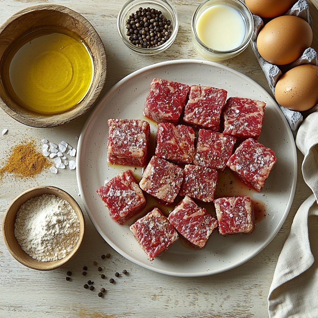 This Chicken Fried Steak with Creamy Gravy Recipe relies on straightforward ingredients that you probably already have on hand, but each plays a crucial role in creating that delicious texture and irresistible flavor. The balance of spices in the flour coating delivers just the right kick, while the eggs and milk work together to make a perfectly crispy crust. The gravy, made from the pan drippings and milk, brings everything together with a silky finish.