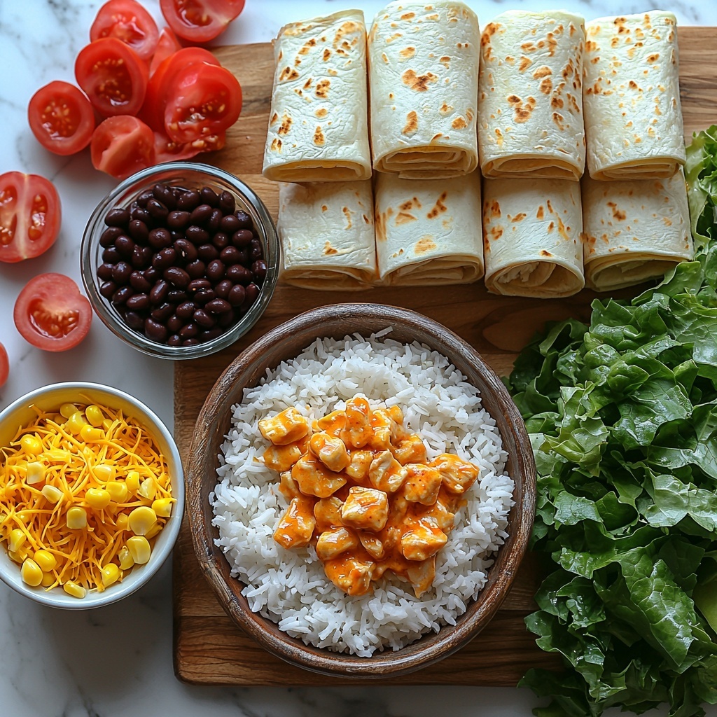 - Assemble the Burritos: Lay each warm tortilla flat and evenly layer on 1/2 cup of cooked rice, the chipotle ranch chicken mixture, 1/4 cup black beans, 1/4 cup corn, shredded cheese, shredded lettuce, and diced tomato.