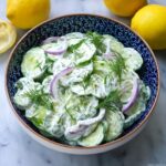 This Cool and Creamy Tzatziki Cucumber Salad is a refreshing and vibrant dish, perfect for hot days or as a delightful side for Mediterranean meals. Featuring sliced English cucumbers and red onions tossed in a luscious homemade tzatziki dressing with Greek yogurt, fresh herbs, and zesty lemon, this salad bursts with bright flavors and creamy textures to satisfy your cravings.