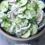 This salad is best eaten fresh and does not freeze well due to the cucumbers’ high water content and the creamy yogurt dressing, which can separate when thawed. For best results, avoid freezing.