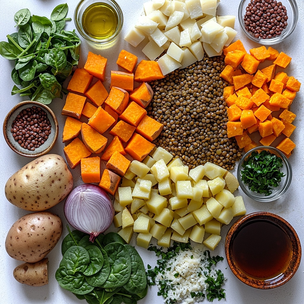 • 2 cups peeled and cubed sweet potatoes: Adds a creamy texture and a naturally sweet flavor that complements the earthiness of the lentils.