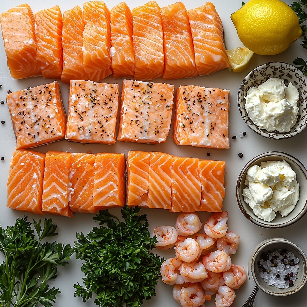 Delight in this elegant Crab and Shrimp Stuffed Salmon recipe featuring tender salmon fillets filled with a creamy, flavorful mixture of crab meat, chopped shrimp, and cream cheese, enhanced with fresh parsley and a hint of lemon juice. Baked to perfection, this dish offers a perfect balance of seafood richness and delicate seasoning, ideal for a special dinner or a sophisticated yet easy meal.