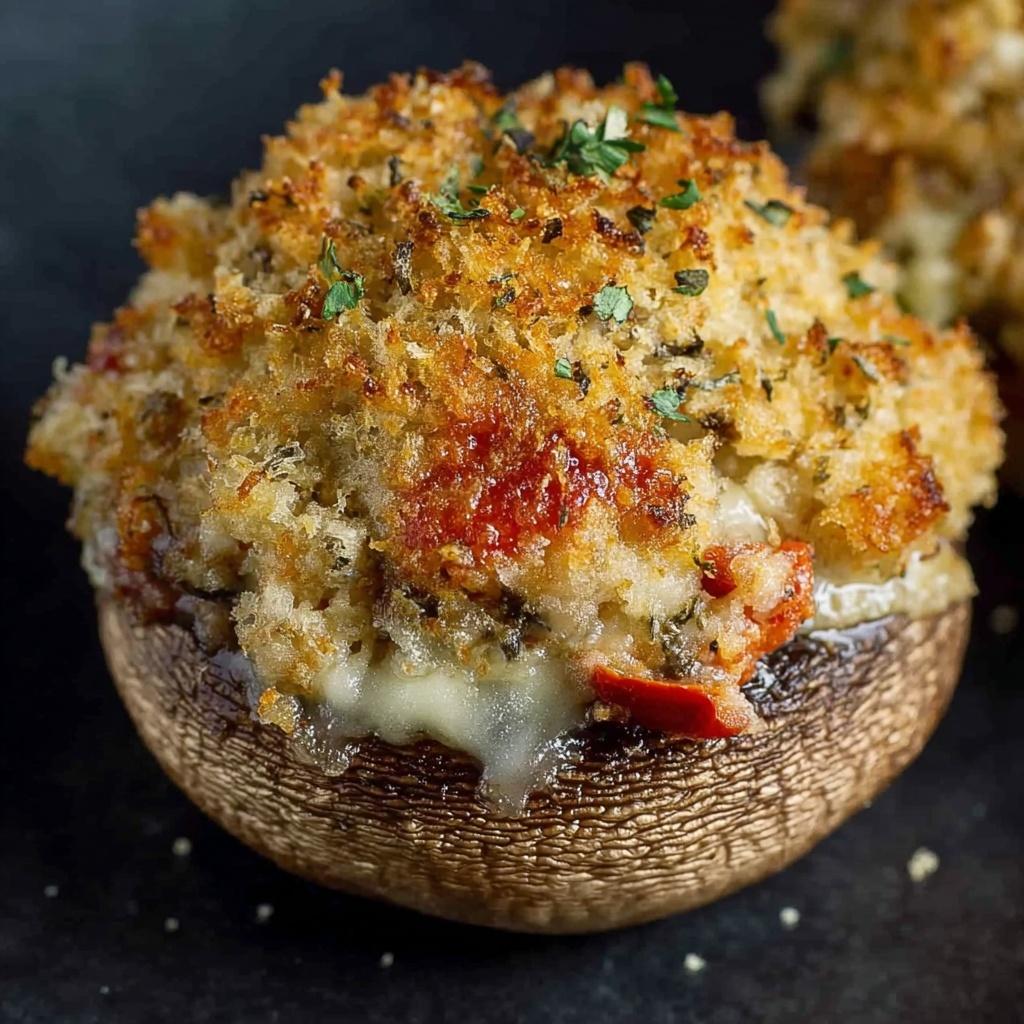 Sprinkle the remaining shredded Gruyere cheese over the stuffed mushrooms, followed by a generous dusting of seasoned panko breadcrumbs. This topping is going to bake into a golden, crispy layer that adds a gorgeous texture contrast to the creamy filling and tender mushrooms underneath.