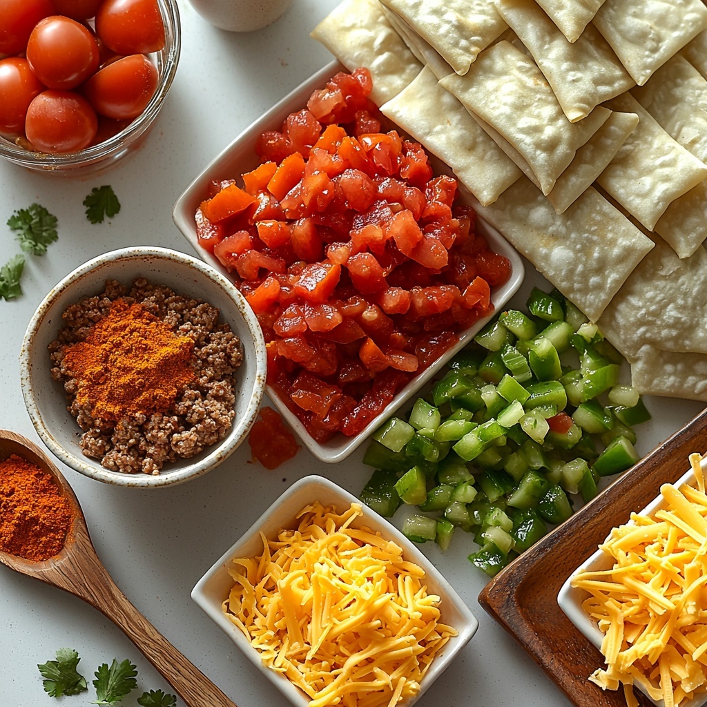 Getting this Crunchy Taco Cups Recipe just right is all about simple, quality ingredients that work in harmony to create layers of flavor and texture. Each component plays a unique role—beef for heartiness, seasoning for that classic taco zing, tomatoes to add a subtle kick, cheese for gooey goodness, and wonton wrappers for crunch and structure.