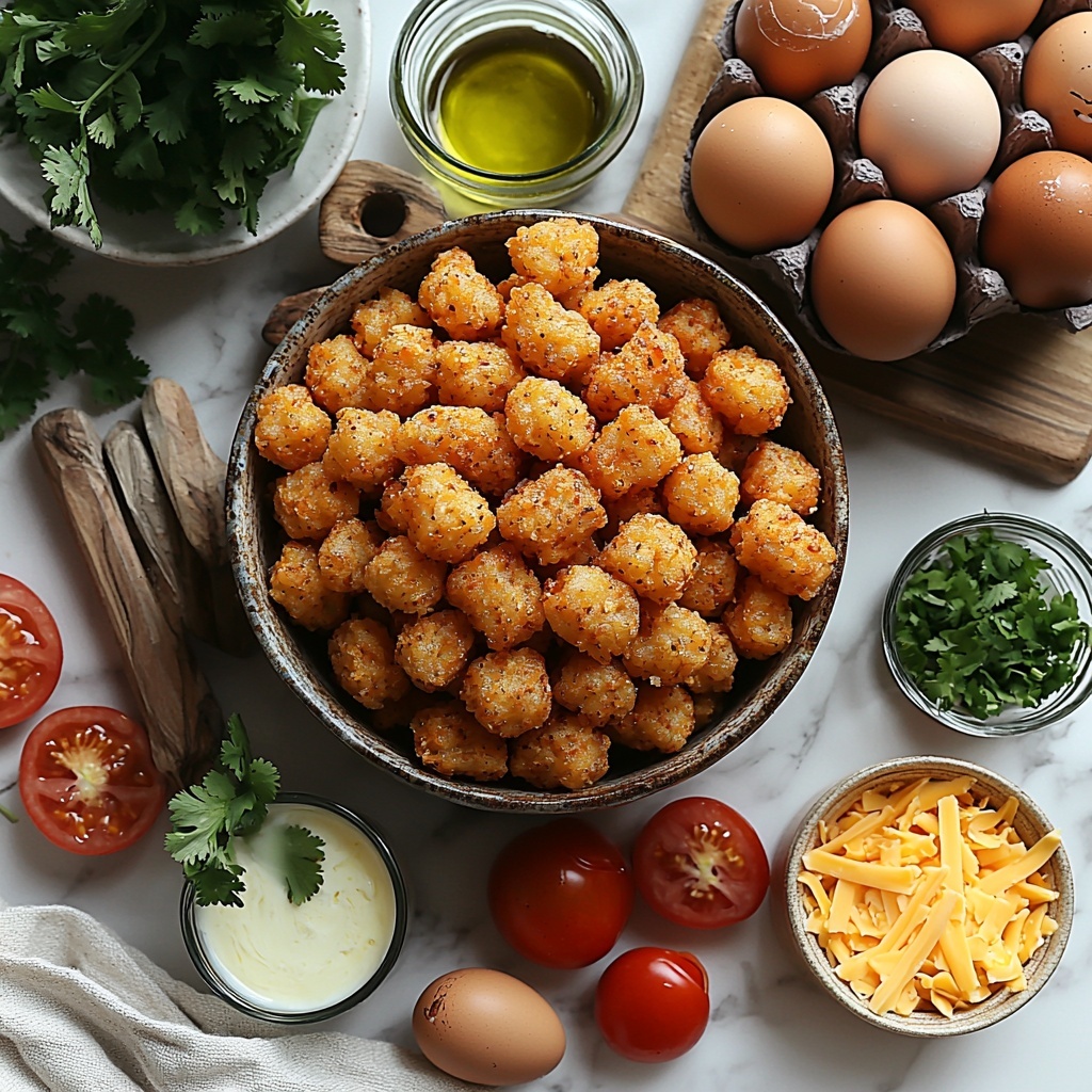 The beauty of this recipe lies in its simple yet essential ingredients. Each component adds a unique flavor or texture, from the golden crunch of tater tots to the creamy richness of the eggs and cheeses, creating a perfect bite every time.
