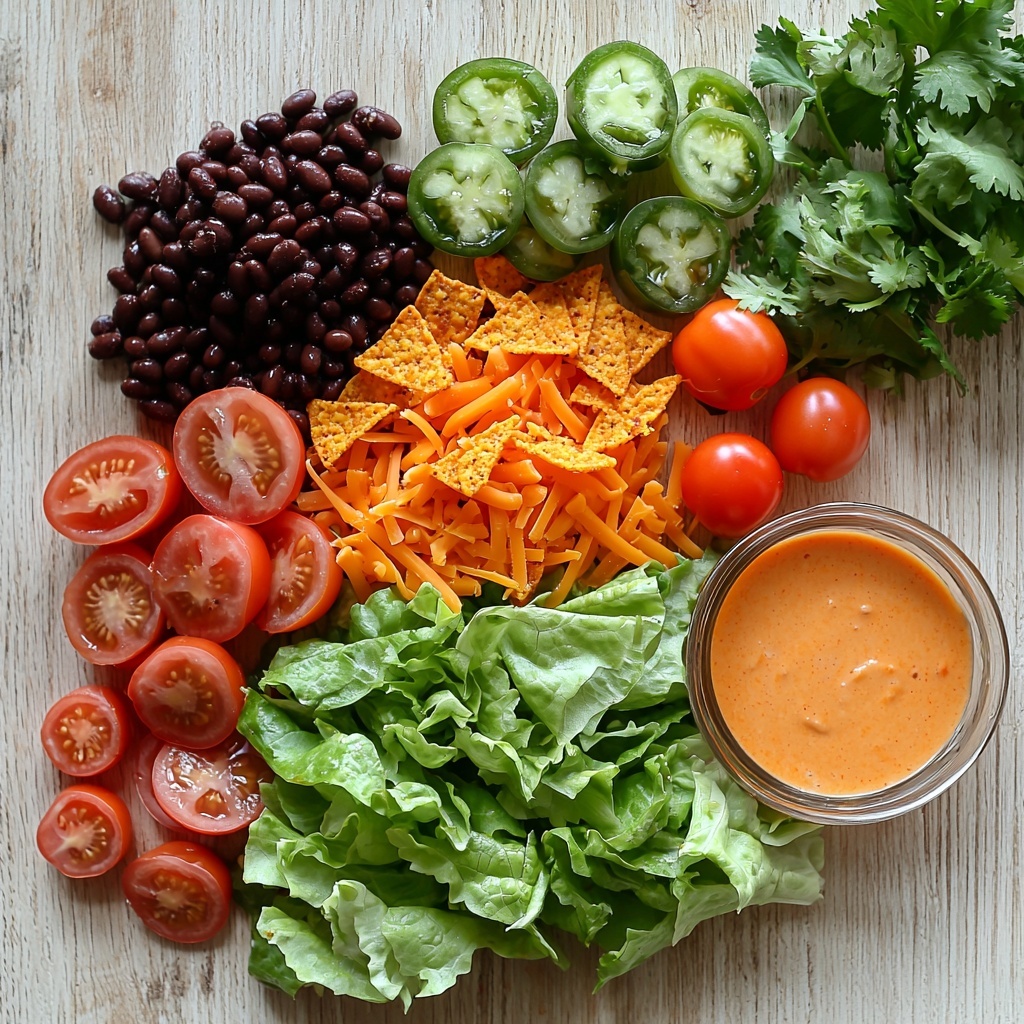 While the beef simmers, prepare the fresh ingredients that make this salad ultra-refreshing and colorful. In a large salad bowl, combine the chopped Romaine lettuce, rinsed black beans, juicy tomatoes (either chopped large or halved cherry tomatoes), and shredded cheddar cheese. This mixture provides a wonderful balance of crispness, creaminess, and vibrant flavor. Once your beef has cooled just enough, add it in and gently toss everything together so all the ingredients mingle but keep their delightful individual textures intact. If you’re not serving immediately, you can chill the salad at this point, but be sure to hold off on adding the Doritos and dressing.