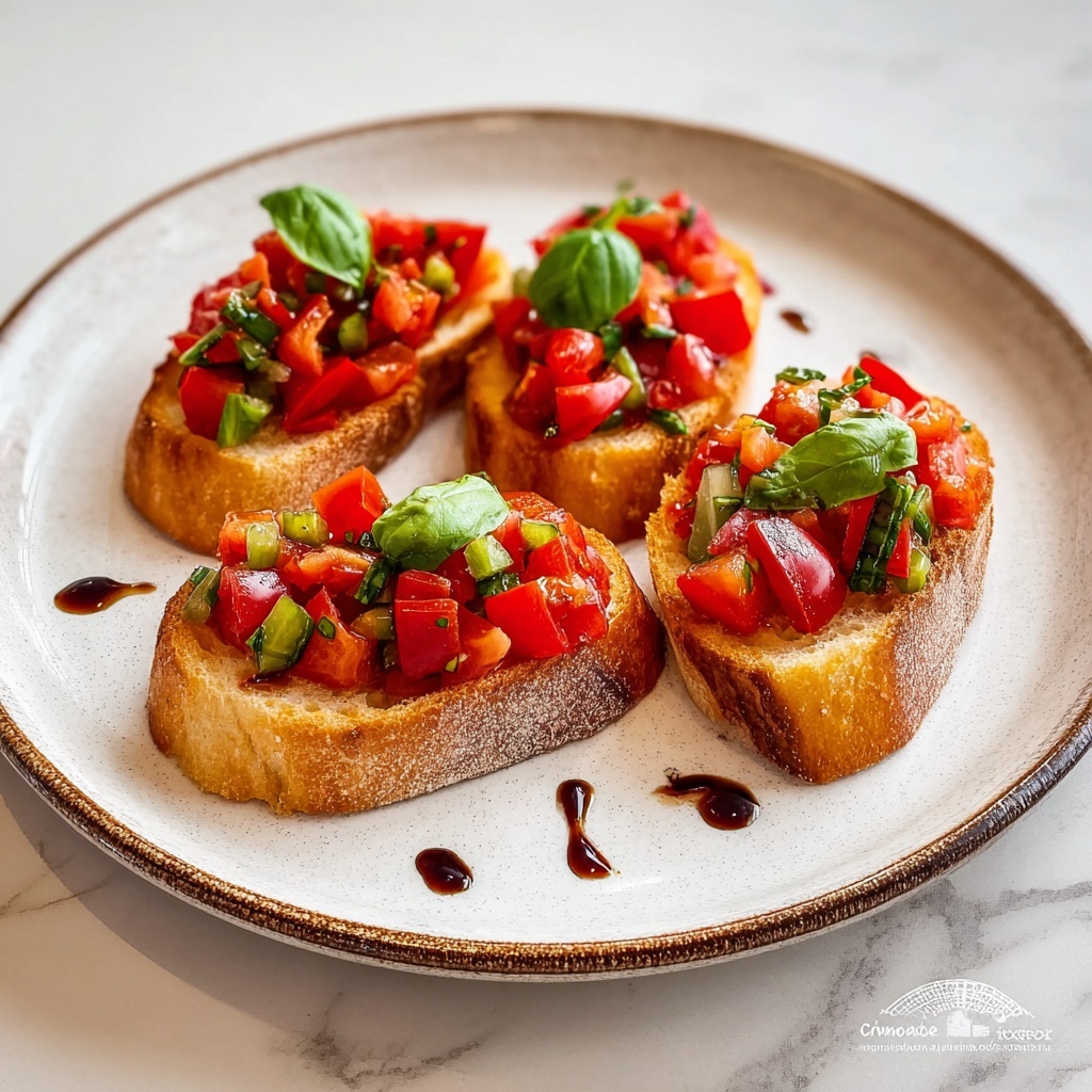 - Assemble and serve: Spoon the tomato and pepper mixture generously onto each toasted baguette slice. Drizzle with additional olive oil, garnish with extra basil, and serve immediately.
