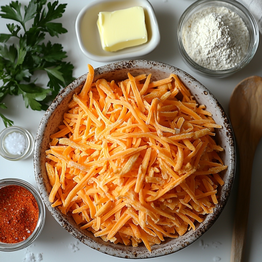 • 1 cup shredded sharp cheddar cheese: Sharpness from this cheese gives the crackers their signature cheesy punch and rich flavor.