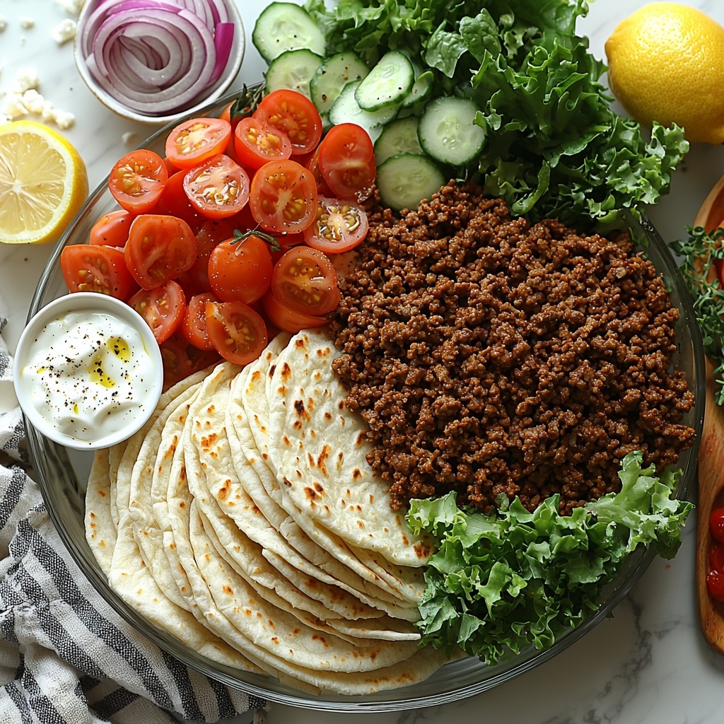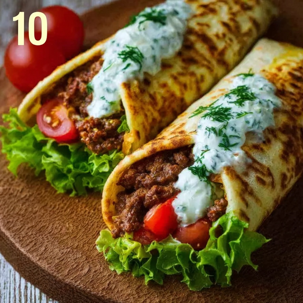 Lay each flatbread flat and spread a generous amount of the cooked beef in the center. Top with a good dollop of cucumber yogurt sauce, then add sliced tomatoes, shredded lettuce, red onion, and crumbled feta cheese to your liking. Roll them up tightly and get ready to enjoy one of the most satisfying dinners you’ll have recently!