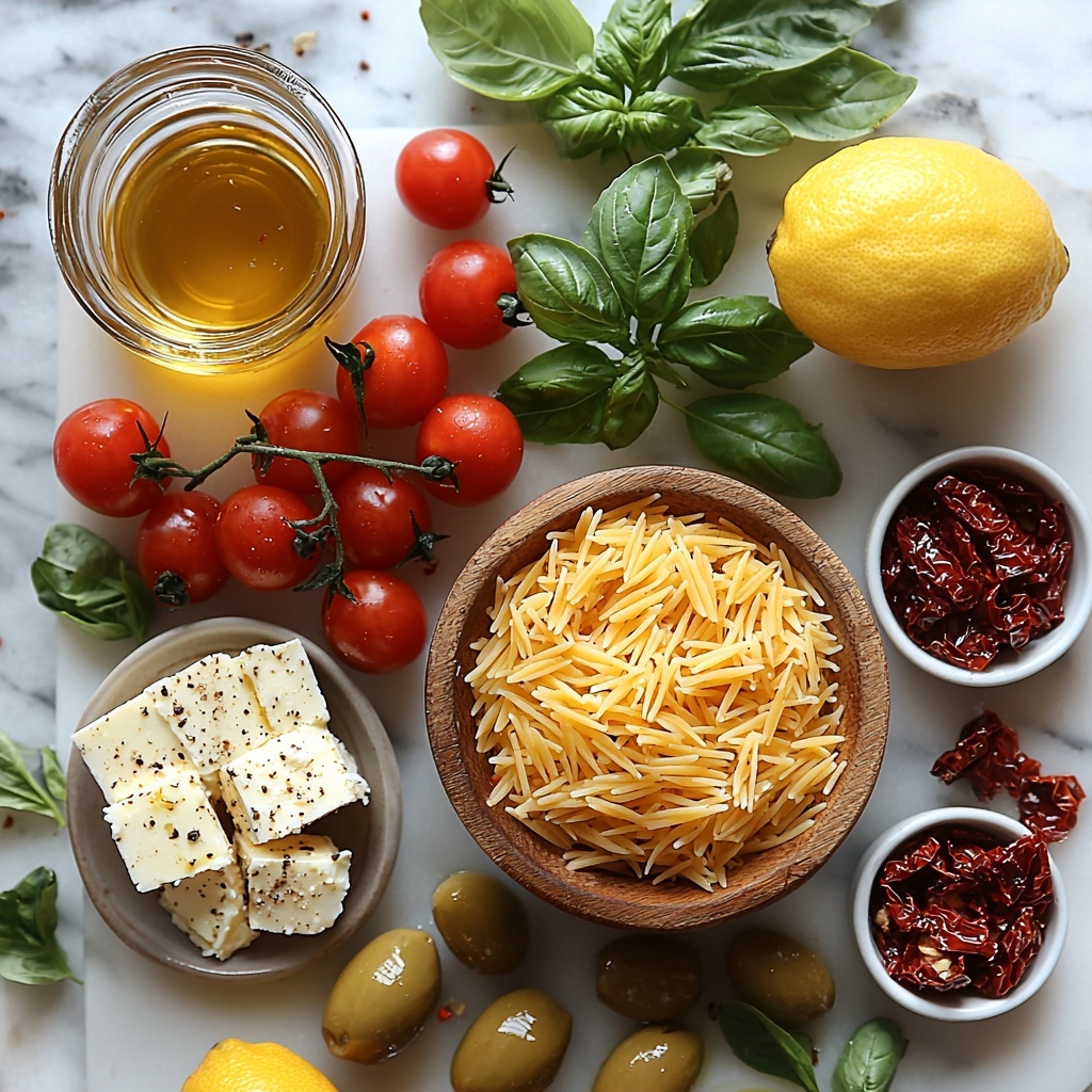 Even though this Greek Orzo with Feta, Sun-Dried Tomatoes, and Olives Recipe feels surprisingly simple, each ingredient plays an essential role—whether it’s to bring texture, vibrant color, or bold flavor. Here’s what you’ll need to create this irresistible dish from scratch.