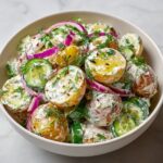 This Greek Yogurt Potato Salad with Cucumbers offers a refreshing and healthy twist on the classic potato salad. Creamy Greek yogurt replaces mayonnaise, providing a tangy flavor and a boost of protein. Fresh cucumbers, red onion, lemon juice, and dill add crispness and bright herbaceous notes, making it a perfect side dish for warm weather meals or potlucks.