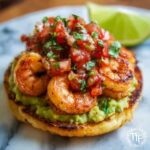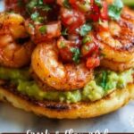Finally, place the crunchy tostada shells on serving plates. Spread a generous layer of your silky guacamole over each shell, then top with perfectly grilled shrimp. Pile on the fresh pico de gallo to finish. Serve these immediately for the ultimate combination of textures — crisp shells, creamy avocado, succulent shrimp, and refreshing salsa all in one delicious bite.