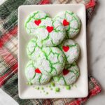 These festive Grinch Cookies are a fun and colorful treat inspired by the beloved holiday character. Made with vanilla cake mix and tinted green, these soft, chewy cookies are rolled in a powdered sugar and cornstarch mixture for a delicate crust, then topped with heart-shaped sprinkles or red candies for a sweet, decorative touch. Perfect for Christmas parties or as a holiday gift, these easy-to-make cookies bring joy and whimsy to your festive dessert tray.