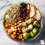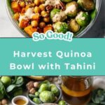 A nourishing Harvest Quinoa Bowl featuring roasted butternut squash and Brussels sprouts, protein-packed chickpeas, fresh apple slices, dried cranberries, and toasted pecans, all served over a bed of spinach or mixed greens and drizzled with a creamy, tangy tahini dressing. Perfect for a wholesome, flavorful vegetarian meal that’s easy to prepare and ideal for meal prep.