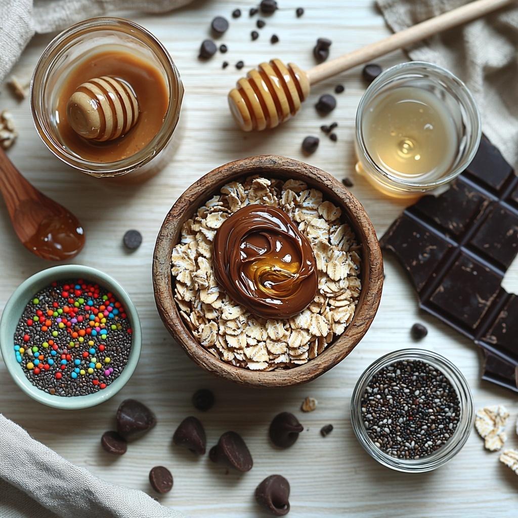 - Combine dry ingredients: In a large mixing bowl, mix the rolled oats, chocolate protein powder, cacao powder, salt, and chia seeds (if using) thoroughly to ensure even distribution of all dry components.