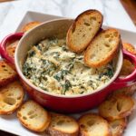 Feeling extra festive? Serve your Healthy Spinach Artichoke Dip Recipe baked inside a hollowed-out sourdough boule for a rustic, shareable presentation. Or portion it out into individual ramekins for a charming personal touch — perfect for parties or cozy date nights.