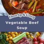 This hearty Vegetable Beef Soup features tender beef stew meat simmered with a medley of fresh vegetables and aromatic herbs in a rich beef broth. Perfect for a comforting meal, this soup combines nutritious ingredients like potatoes, green beans, corn, and peas, making it both satisfying and wholesome.