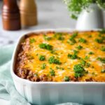 A sprinkle of fresh parsley is simple but magical for this casserole. You could also add a dollop of sour cream or a scattering of sliced green onions to complement the rich, cheesy, and meaty elements of the dish.