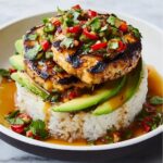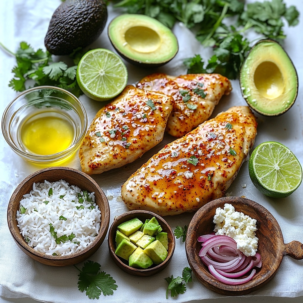A vibrant and flavorful Honey Lime Chicken & Avocado Rice Stack featuring marinated grilled chicken breasts served over cilantro-infused lime rice, topped with creamy avocado, red onion, and crumbly cheese for a refreshing, balanced meal that’s perfect for a wholesome lunch or dinner.