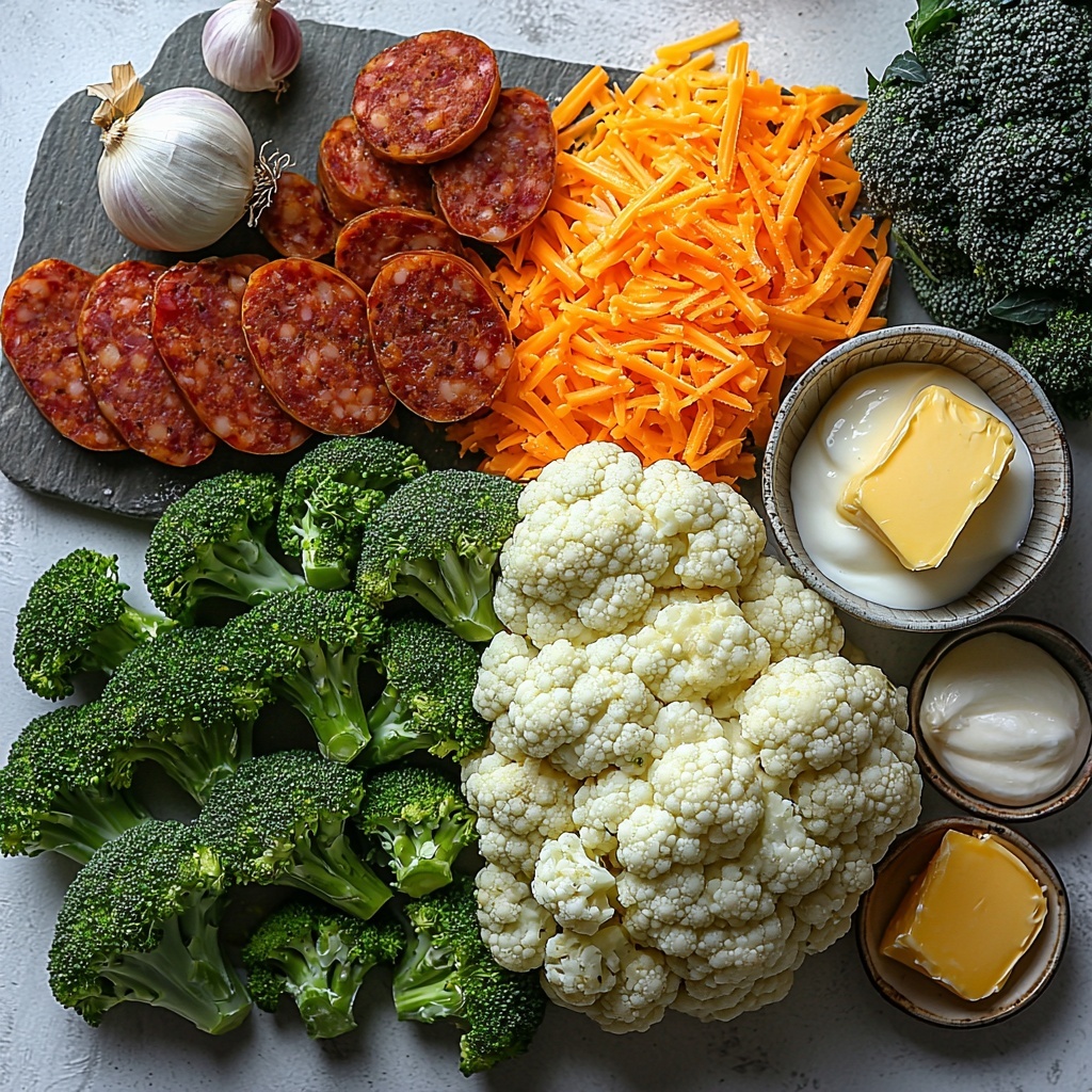 To create this delightful Keto Broccoli And Cauliflower Au Gratin With Sausage Recipe, you only need a handful of simple, wholesome ingredients that work in perfect harmony to build rich flavor and satisfying texture. Each component plays an essential role: the fresh veggies provide a vibrant bite, the sausage adds heartiness, and the creamy sauce ties everything together with cheesy goodness.