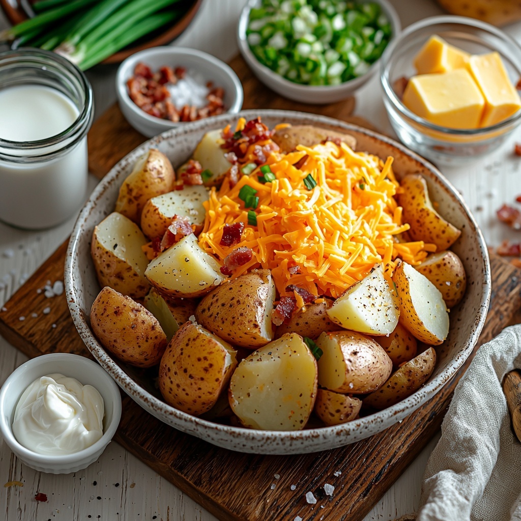 This recipe shines because of its simple but essential ingredients, each contributing uniquely to the texture, flavor, and color. The russet potatoes provide a hearty, fluffy base, while the cheeses and bacon deliver rich, savory notes. Fresh green onions add a pop of color and brightness to balance the creaminess perfectly.