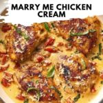 Marry Me Chicken is a luscious, creamy chicken dish simmered in a rich sun-dried tomato cream sauce with parmesan and herbs. This comforting recipe features tender, juicy chicken breasts cooked to perfection and bathed in a flavorful sauce of sun-dried tomatoes, garlic, oregano, and a hint of crushed red pepper flakes. Garnished with fresh basil and extra parmesan, it’s a guaranteed crowd-pleaser perfect for weeknight dinners or special occasions.