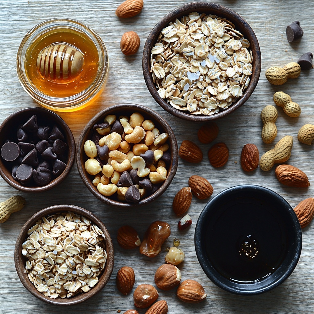 The ingredients for this recipe are straightforward yet thoughtfully chosen to deliver incredible flavor and texture. Each one plays a crucial role — from the crunch and heartiness of the nuts and oats to the smooth sweetness of honey combined with the rich depth of dark chocolate and just a pinch of sea salt to elevate every bite.