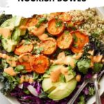 Bring all your ingredients together by tossing the massaged kale, cooked quinoa, shredded red cabbage, shredded chicken, and thin red onion slices in your bowl. Add the roasted sweet potatoes and sliced avocado on top, then drizzle generously with the creamy chipotle sauce. Garnish with torn cilantro leaves for a fresh, aromatic finish. Now, dig in and savor this symphony of textures and flavors!
