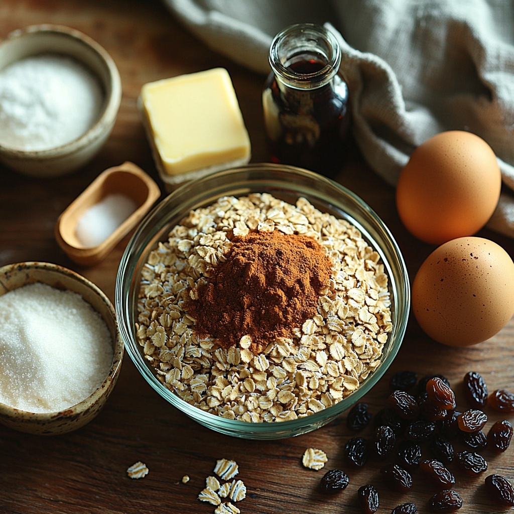 Whipping up these delightful Oatmeal Raisin Cookies Recipe requires just a handful of simple, pantry-friendly ingredients, each thoughtfully chosen to contribute flavor, texture, and that perfect golden color.