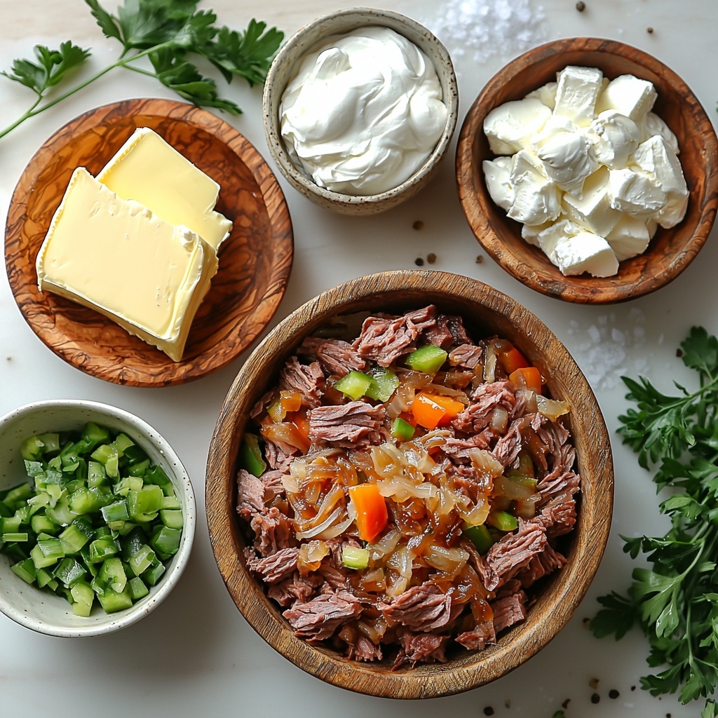 Don’t let the ingredient list intimidate you; these simple, everyday staples come together to create a harmonious blend of textures and flavors that make this dip so memorable. Each component plays a special role—from the creamy cheeses lending richness to the sautéed veggies adding sweetness and the roast beef bringing that signature savory punch.