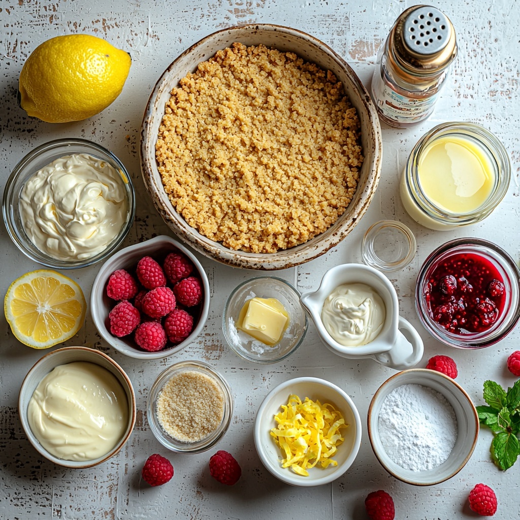 Gathering the right ingredients is key to nailing this recipe. Each one plays a crucial role: from forming that buttery, crunchy base to lending the creamy lemon tang and the fresh raspberry sweetness that makes this cheesecake spectacular.