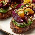 This vibrant Roast Beetroot & Orange Bruschetta combines the earthy sweetness of roasted beets with the bright, tangy freshness of orange segments, topped on toasted baguette slices with creamy goat cheese and a hint of fresh mint. Perfect as a colorful appetizer or light snack, it’s both visually appealing and bursting with flavors.