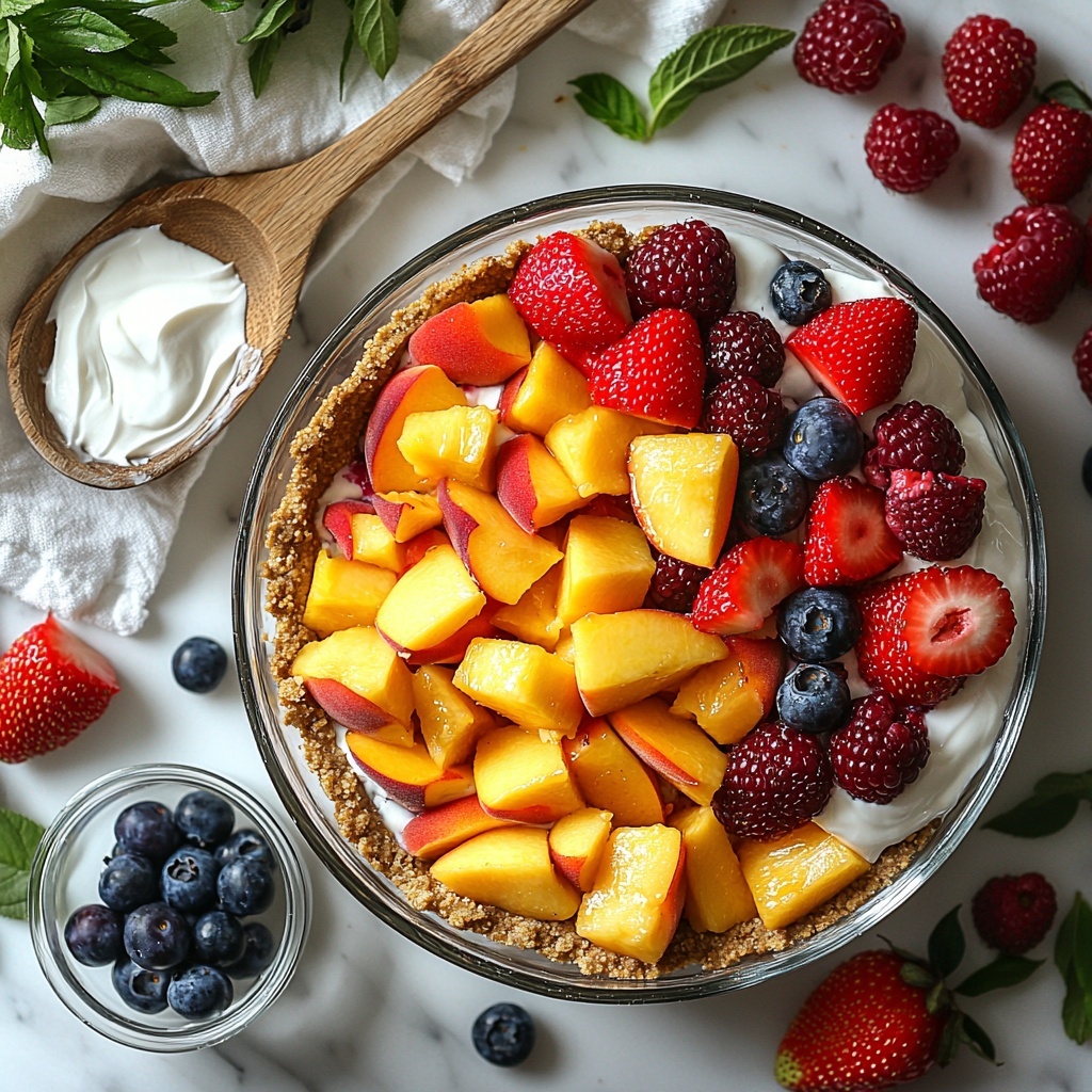 Just before serving, scatter the diced peaches and mixed berries on top. Their natural sweetness and eye-catching colors add fantastic fresh flavors and make each slice stunningly Instagram-worthy without any extra effort.