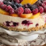 While the fresh peaches and mixed berries themselves provide a beautiful natural garnish, you might consider a few simple additions like a sprig of fresh mint or a light dusting of powdered sugar for an elegant touch. These little details boost not just appearance but also a refreshing hint of flavor that complements the cheesecake’s richness.