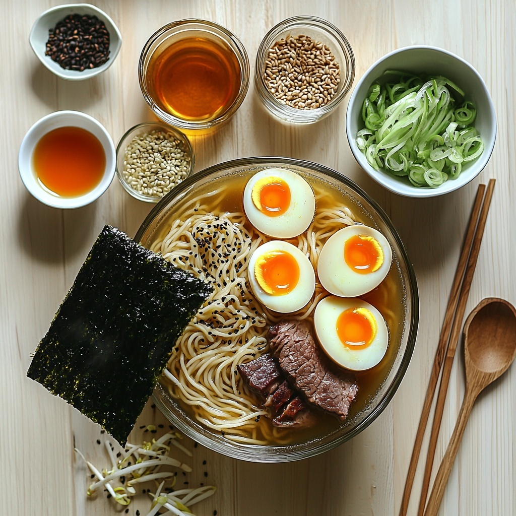 Drain the noodles and divide them evenly between two bowls. Ladle the steaming hot broth over the noodles carefully, then artfully arrange the toppings: soft-boiled eggs, chashu beef slices, bean sprouts, green onions, and strips of nori on top. Each component complements the others perfectly, creating a harmonious, crave-worthy meal.
