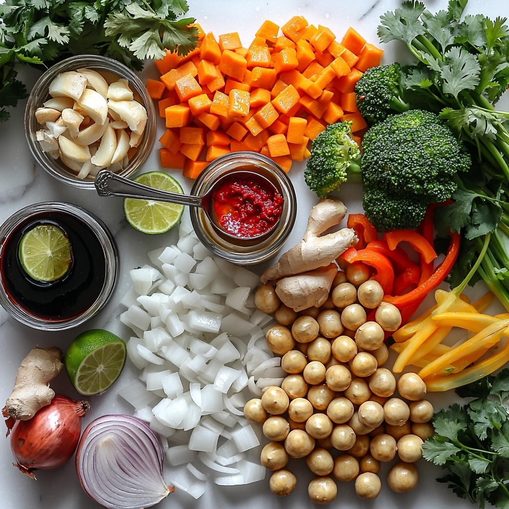 This Thai Coconut Curry Soup Recipe calls for simple yet essential ingredients that work harmoniously to create a symphony of flavors and textures. Each item adds its own special touch, from the richness of coconut oil to the brightness of lime juice, ensuring the soup is balanced and irresistible.