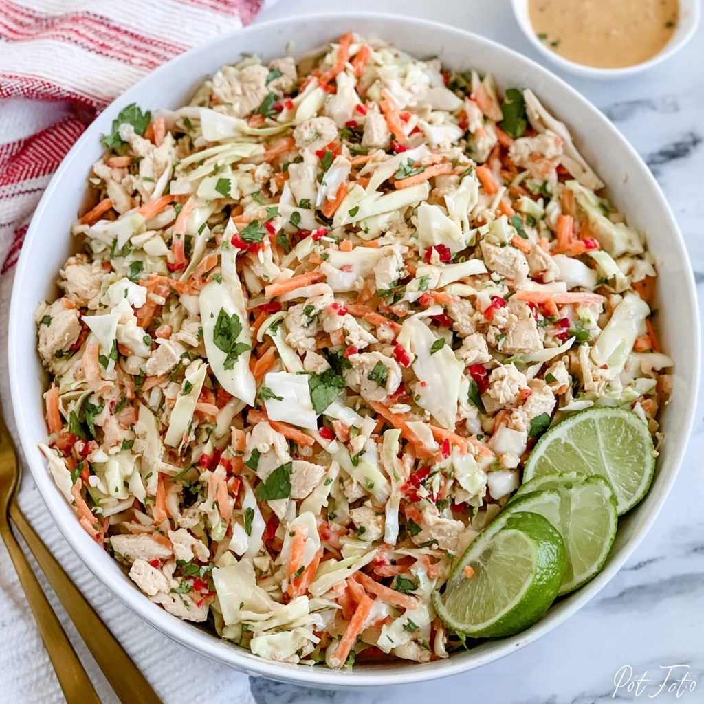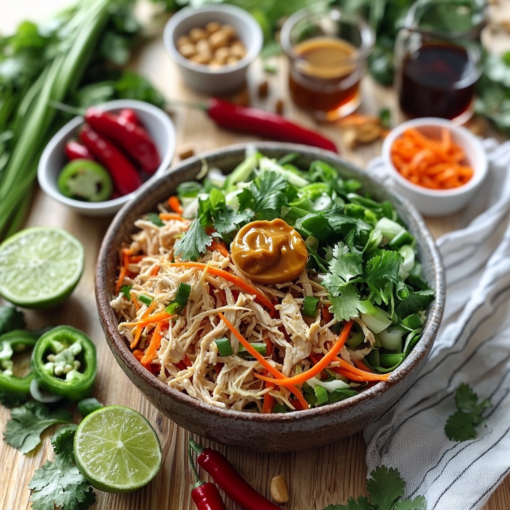 In a large bowl, toss together your shredded cooked chicken, cabbage, carrots, chopped peanuts, fresh cilantro, green onions, and, if you’re feeling adventurous, the Thai chili peppers or jalapenos. This mix bursts with contrasting textures—from tender to crispy—and layers of fresh, vibrant flavors that will impress every bite.