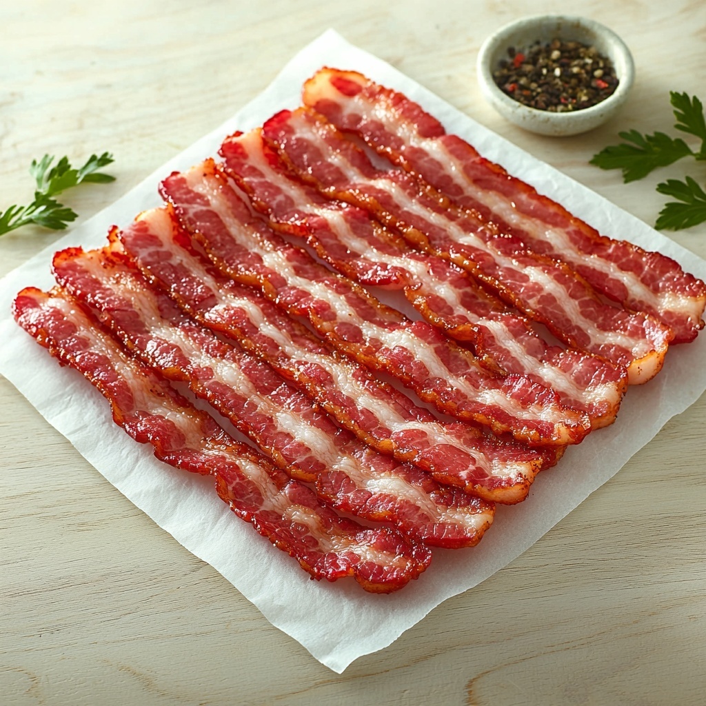 Sprinkle freshly cracked black pepper or a light dusting of smoked paprika over the bacon to add a subtle depth of flavor and a touch of inviting color. You can also toss a few fresh herb sprigs nearby for a hint of green and freshness on the plate.