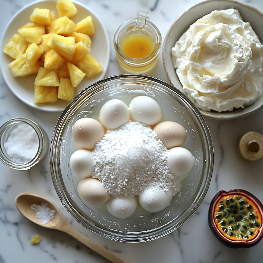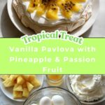 This Vanilla Pavlova with Pineapple & Passion Fruit Recipe calls for a handful of widely loved ingredients that come together to create magic. Each element is simple and familiar, yet essential for achieving the light texture, vibrant flavors, and stunning look that define this dessert.
