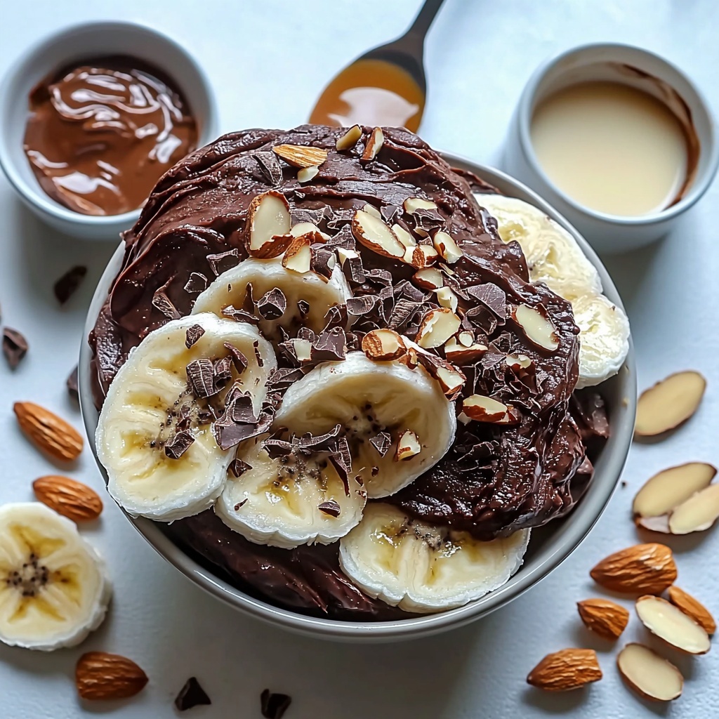 - Assemble and Serve: Scoop the chocolate banana nice cream into serving bowls. Drizzle extra almond butter over the top and finish with your choice of dark chocolate shavings, chopped toasted almonds, and sliced fresh banana for texture and visual appeal.