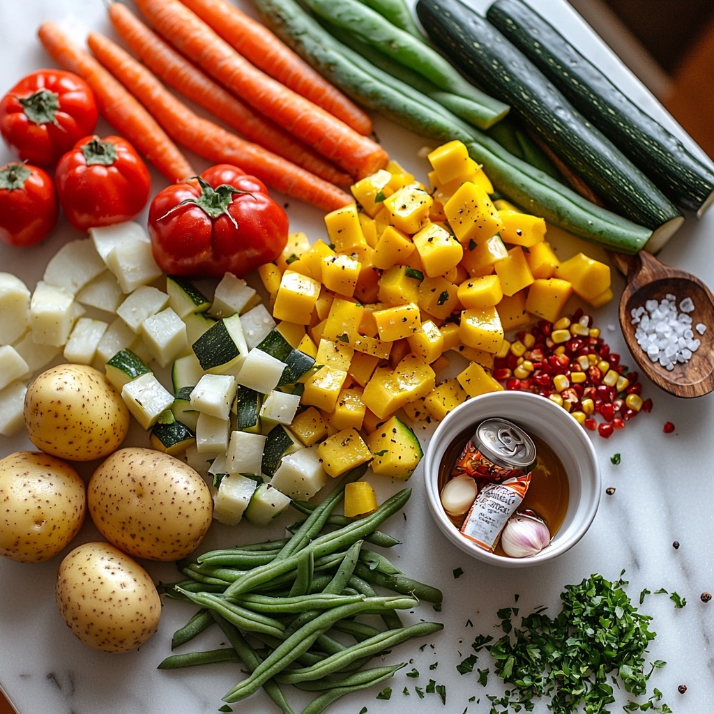 Simple, fresh ingredients form the backbone of this Wholesome Vegetable Stew Recipe. Each one plays a crucial role in building the color, texture, and robust flavor profile that makes this stew so special.